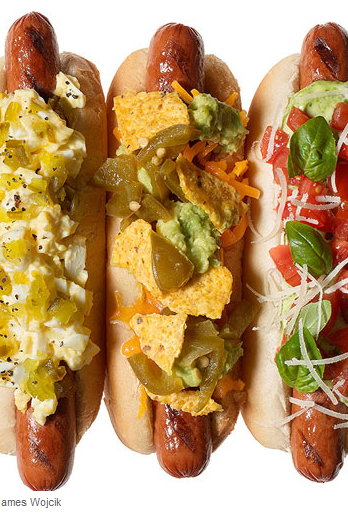 Toss finely chopped celery and carrots in hot sauce. Spoon onto the dog; top with blue cheese crumbles.