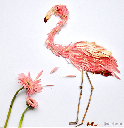 Remember Hong Yi aka Red, the Malaysian artist-architect who challenged herself to create a new piece of food art every day in the month of March? Well, she's making waves again - this time with her adorable, playful creations of exotic birds using flowers, leaves, twigs and sticks she finds in her garden.